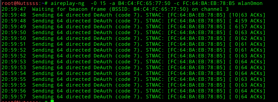 1 | aireplay-ng -0 15 -a <bssid> -c <客户端mac地址> <监听模式的网卡> |