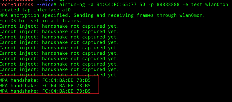 1 | airtun-ng -a B4:C4:FC:65:77:50 -p 88888888 -e test wlan0mon |