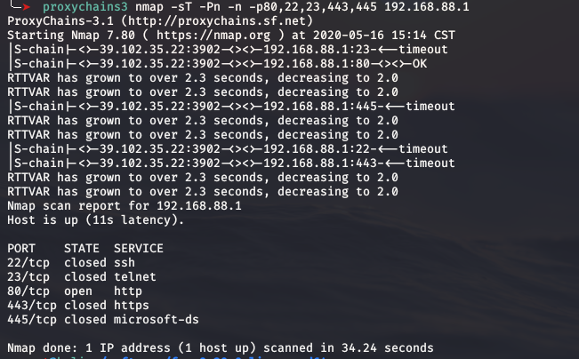 proxychains3 nmap -sT -Pn -n -p80,22,23,443,445192.168.88.1
