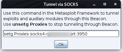- 通过 [beacon] → Pivoting → SOCKS Server 来在你的团队服务器上设置一个 SOCKS4a 代理服务器。或者使用 socks 8080 命令来在端口 8080 上设置一个 SOCKS4a 代理服务器(或者任何其他你想选择的端口)