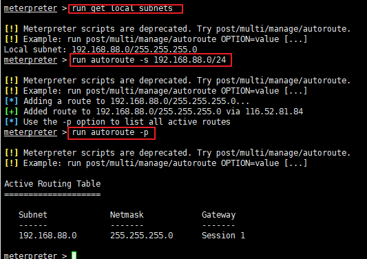 run autoroute -s 192.168.88.0/24查看添加的路由