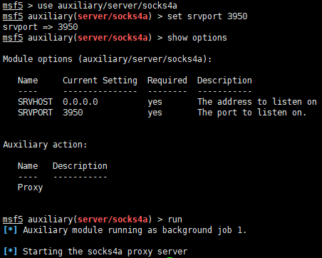 use auxiliary/server/socks4aset srvport 3950