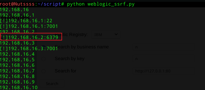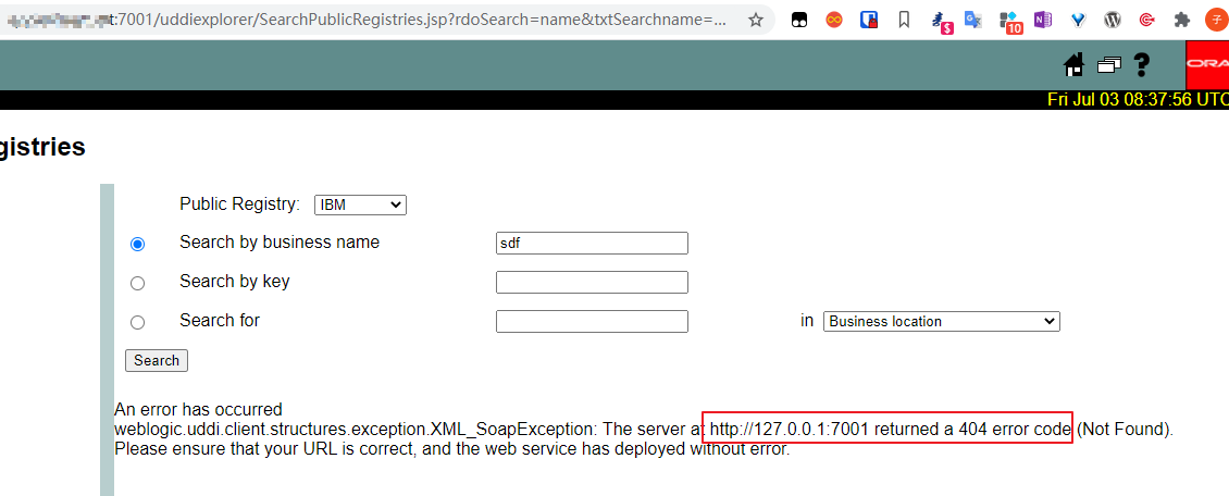 1 | http://ip:7001/uddiexplorer/SearchPublicRegistries.jsp?rdoSearch=name&txtSearchname=sdf&txtSearchkey=&txtSearchfor=&selfor=Business+location&btnSubmit=Search&operator=http://127.0.0.1:7001 |