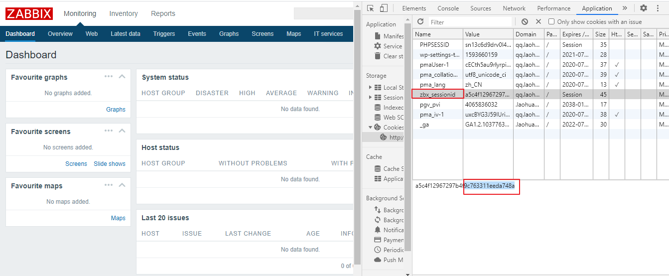 用账号guest(密码为空)登录游客账户,查看Cookie中的zbx_sessionid,复制后16位字符